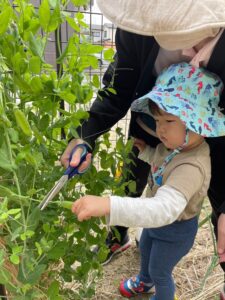 園庭のさやえんどうが収穫時期を迎えたので