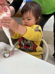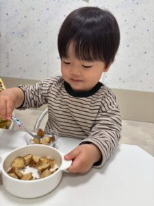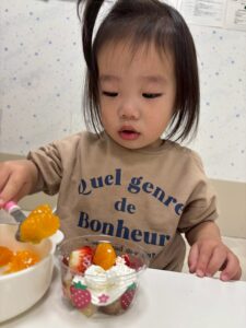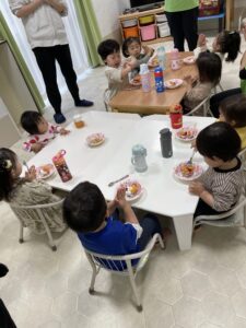 「みかん」「ドーナツ」と自分たちで盛り付けをして、